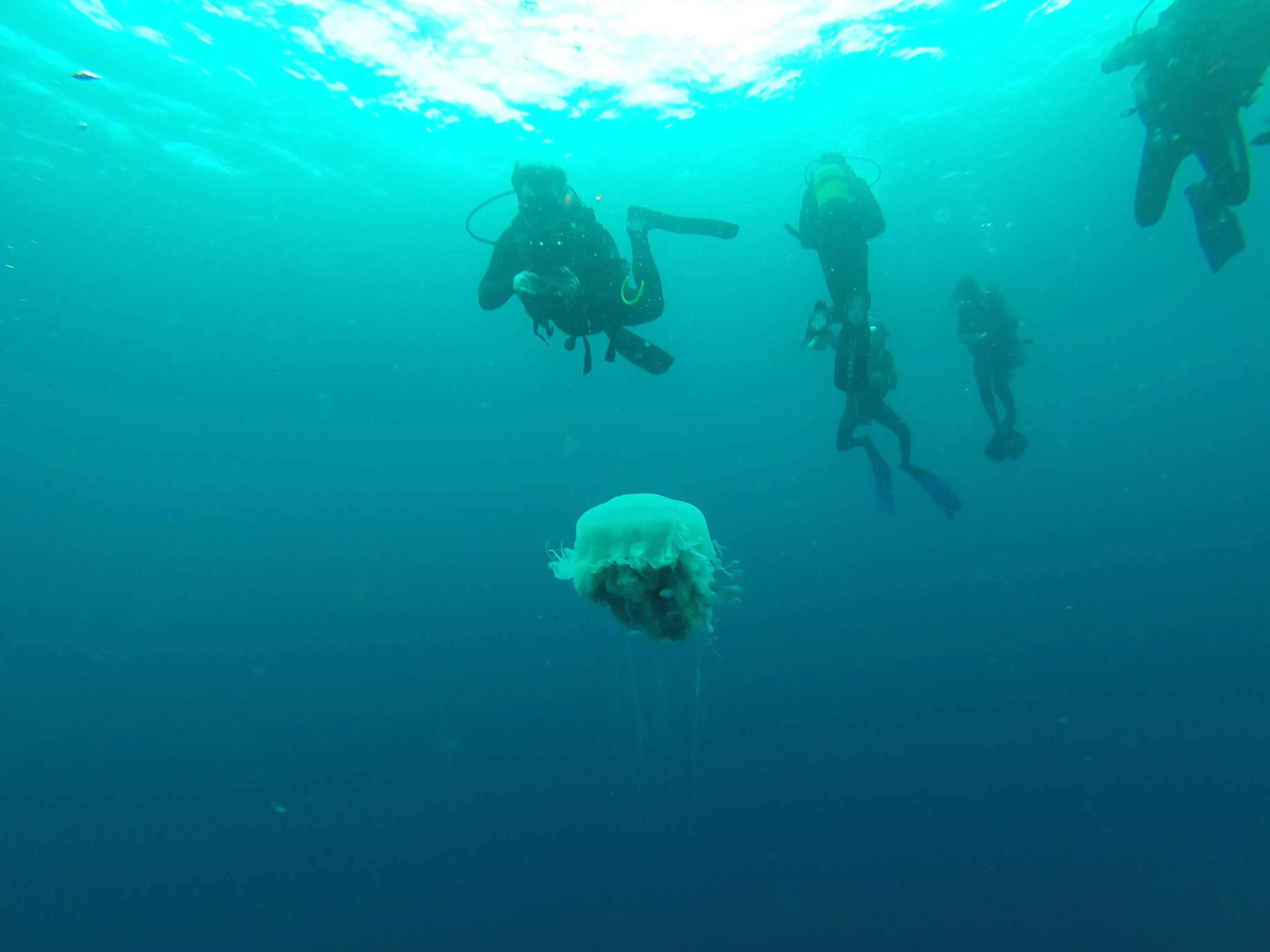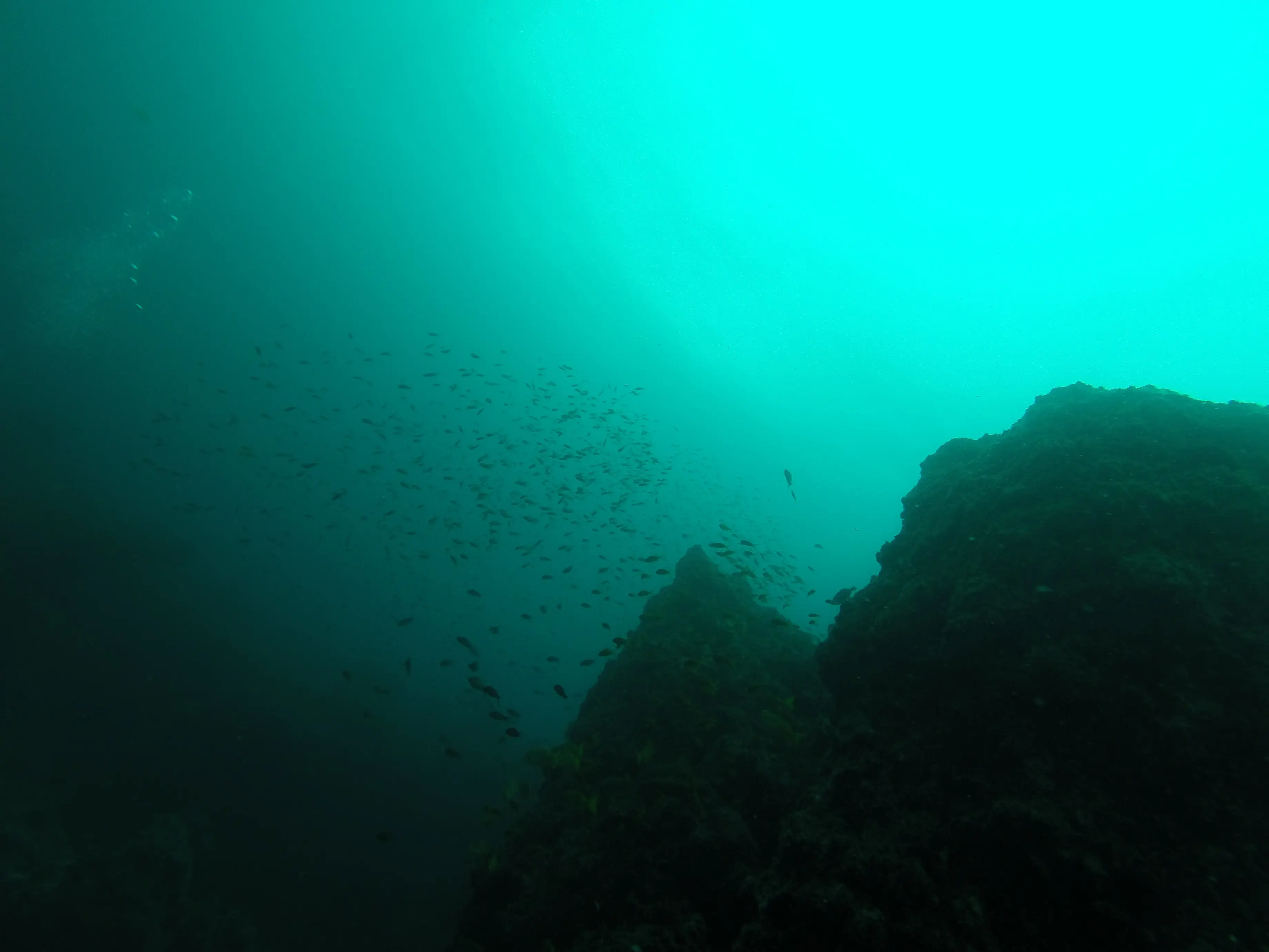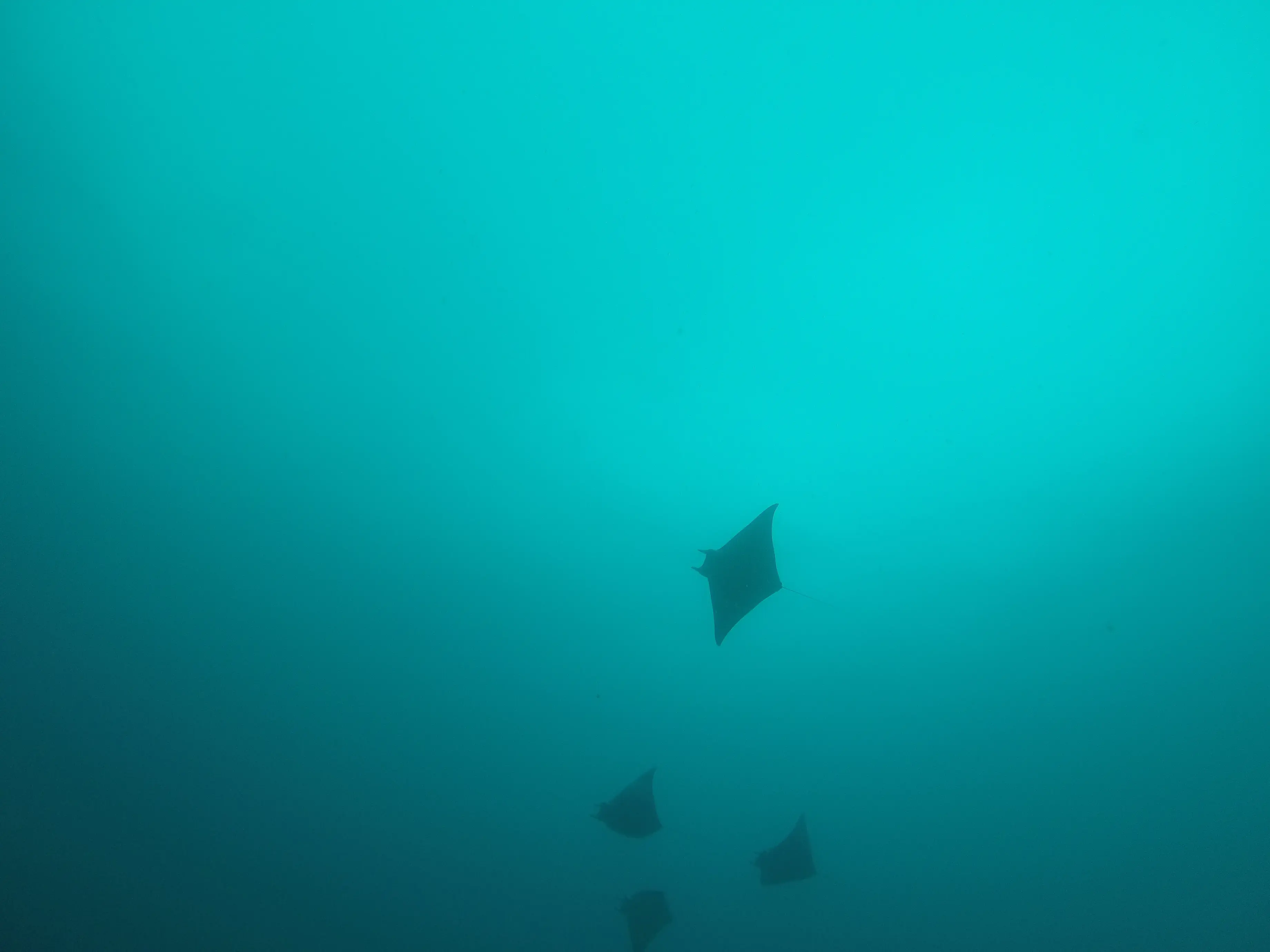 Laura looking up from Manta Reef towards ~100 rays swimming above us