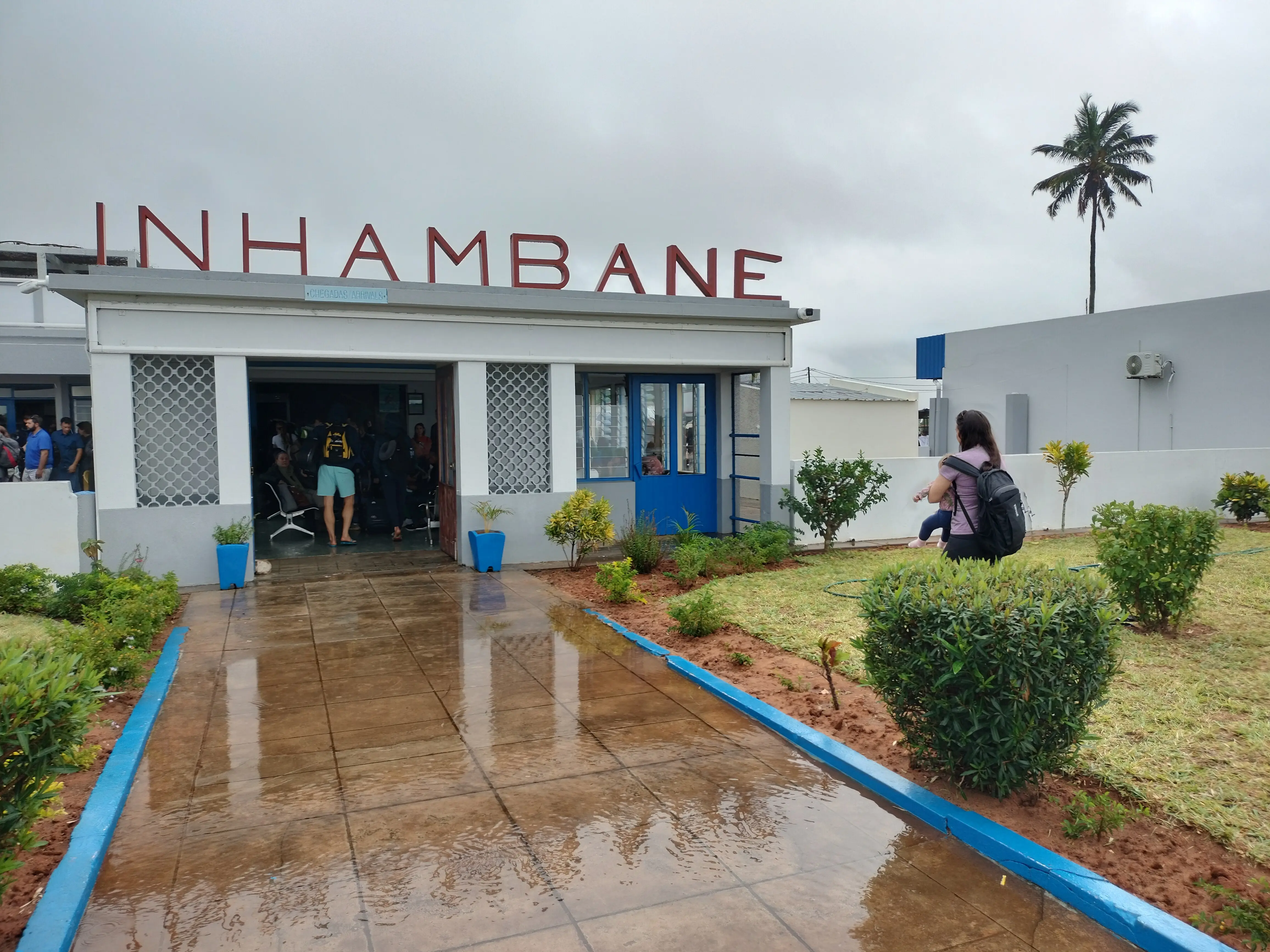 Fortunately the second attempt worked. We didn’t die and successfully landed in Inhambane in the pouring rain. The airport is small, only one ‘terminal’. A few guys approached us and asked if we needed a taxi. We picked the one with the biggest car … an old beatup hatchback. In the downpour the driver struggled to load all of our suitcases. They didn’t fit. Determined, he used whatever he could find in his car to somehow tie the trunk closed with our suitcases hanging out. With bags and strollers on our laps we set off on our 30 minute drive to Tofo - everything soaking wet.