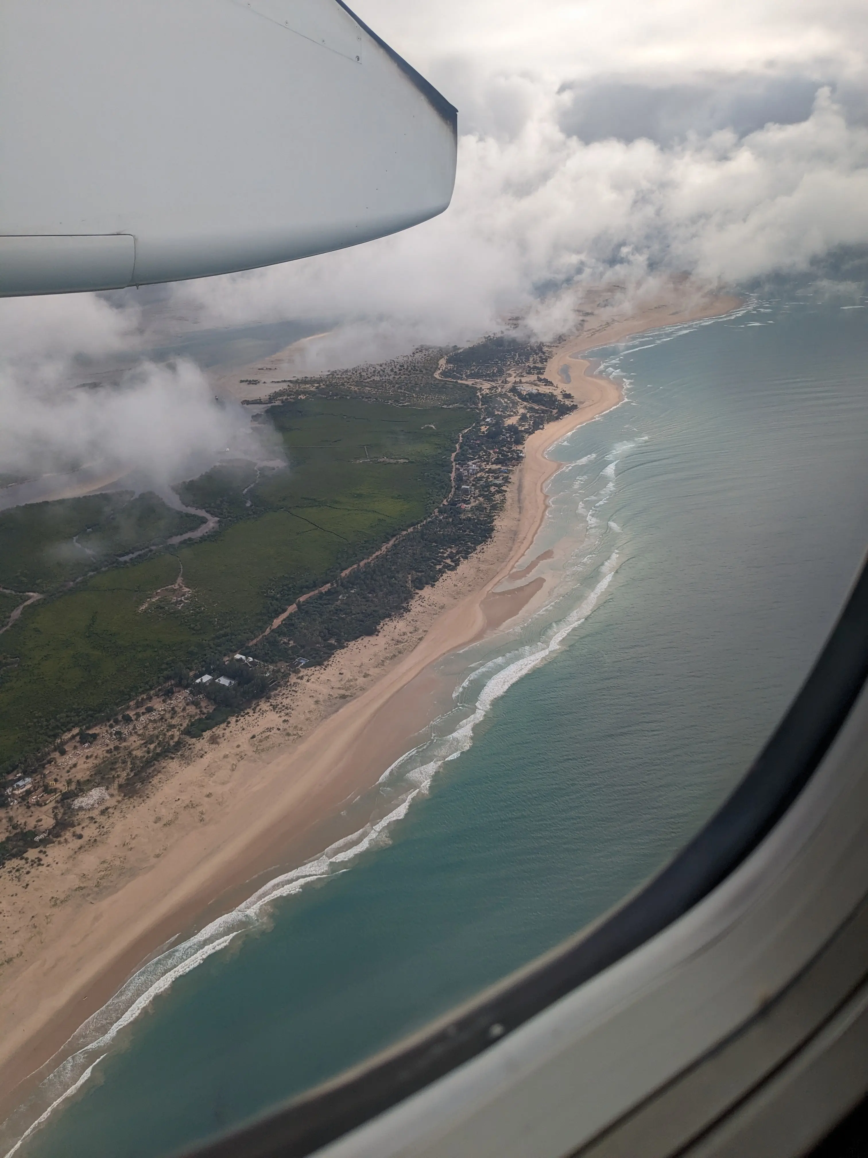 As we approach Inhambane (regional airport for Tofo), the views are spectacular. Beautiful stretches of white sandy beaches, palm trees and clear blue water. However we only get glimpses of this paradise between the dark storm clouds. At one point the airplane does a ‘fly by’ of the beach. While it provides for a great view, it was certainly not part of it’s normal route, we’re circling and turbulence is rough. It’s clear the pilot is struggling with this storm and were told that if the next landing attempt is unsuccessful then we’ll have to turn around and go back to Maputo.
